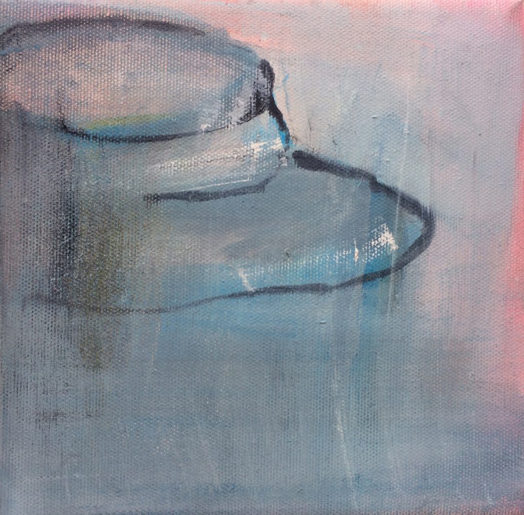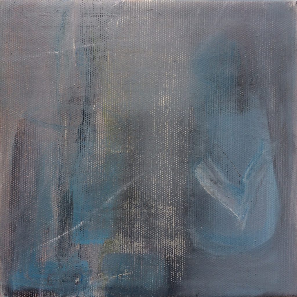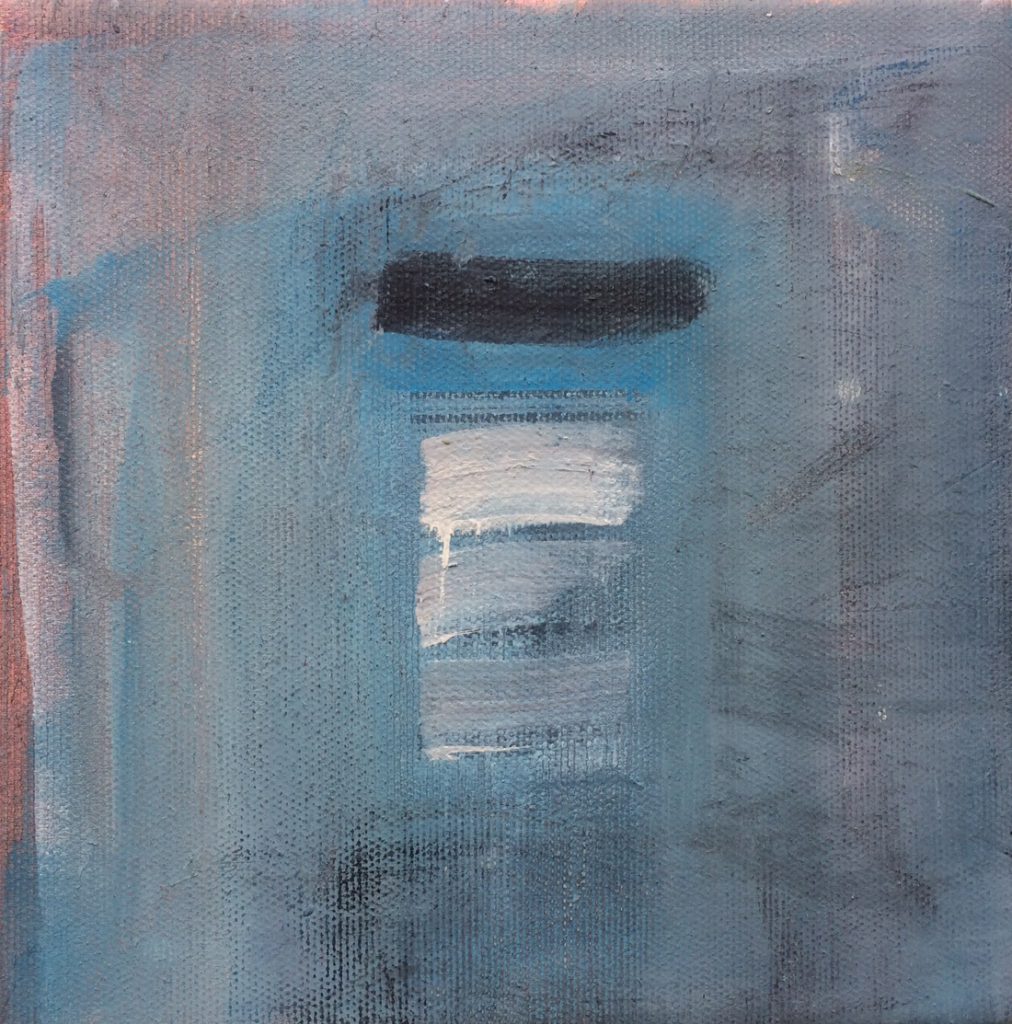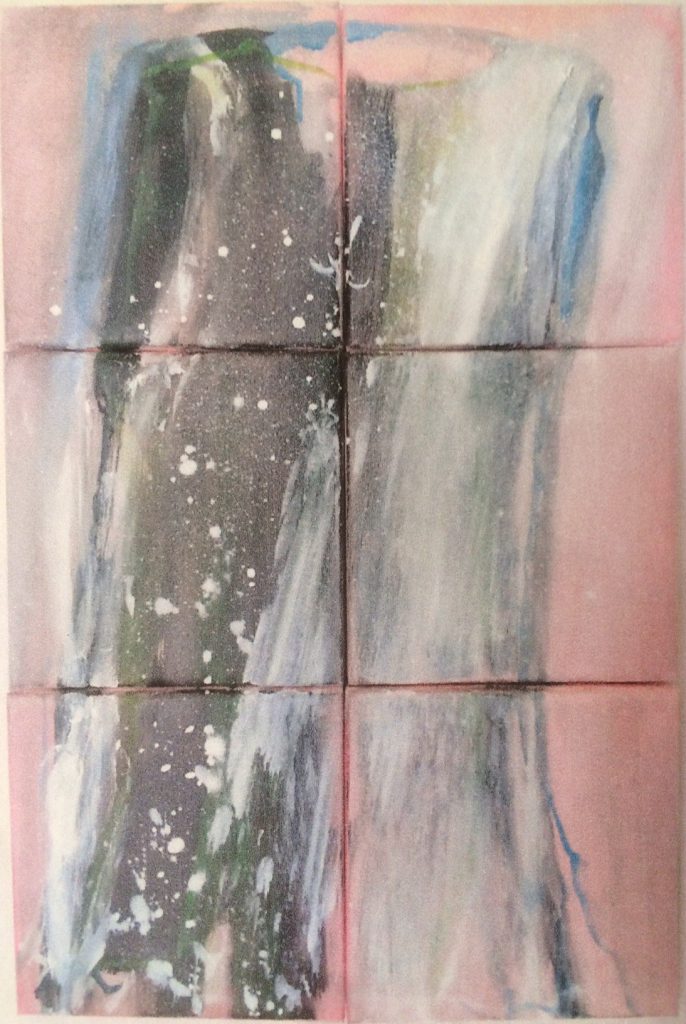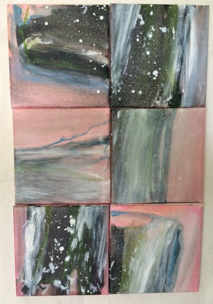Eine Geschichte mit unvorhergesehenen Umwegen! In meinem Fundus befanden sich sechs kleine Rahmen – 20×20 – die ich mal günstig erstanden hatte. Mittlerweilen arbeitete ich aber mit grösseren Formaten und wusste nicht mehr so recht, was ich mit ihnen anfangen sollte. Ich hatte die Idee, dass mit sechs kleinen Bildern eine Art grosses Puzzle entstehen könnte. Die einzelnen Bilder sollten so bemalt werden, dass sie – gedreht und verschoben – immer neu zu einem stimmigen Werk zusammengefügt werden könnten, in zahllosen Variationen.