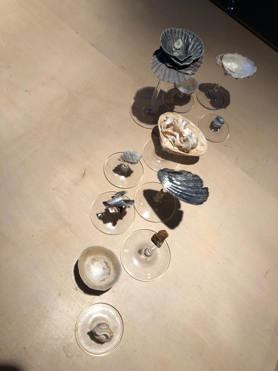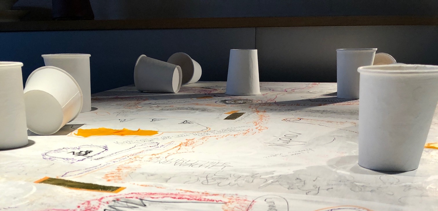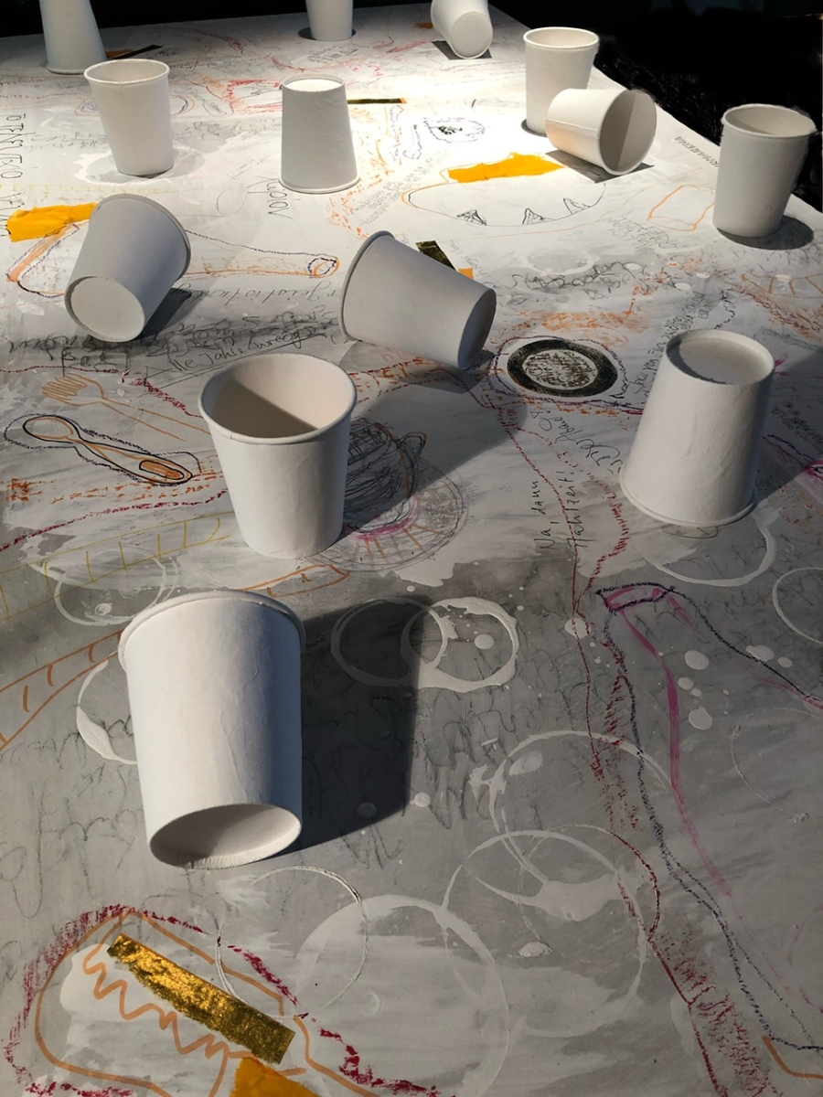 Gründonnerstag, 2024; 180x 95 Pavatexplatte, Pappbecher, Dispersion, Filsstifte, Bleistift, Papier-und Folienreste, 2024.