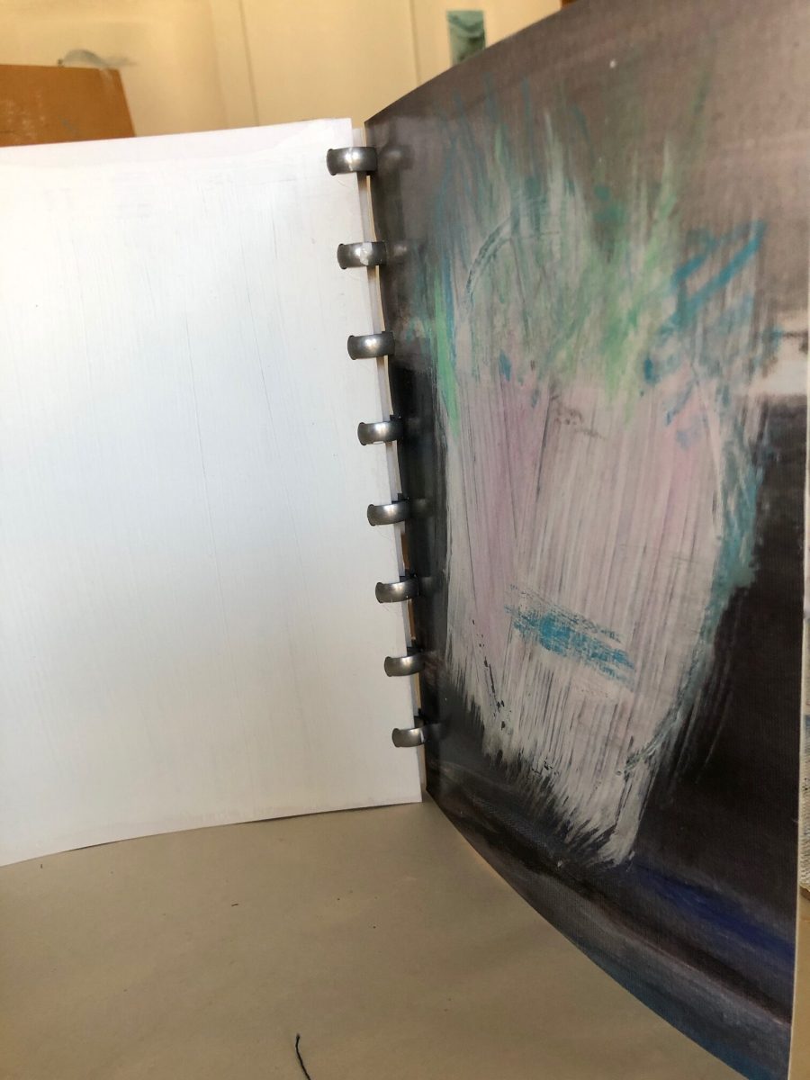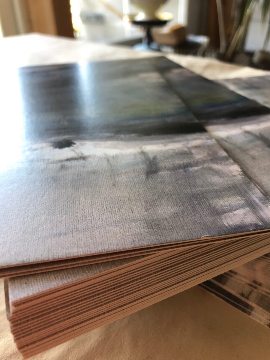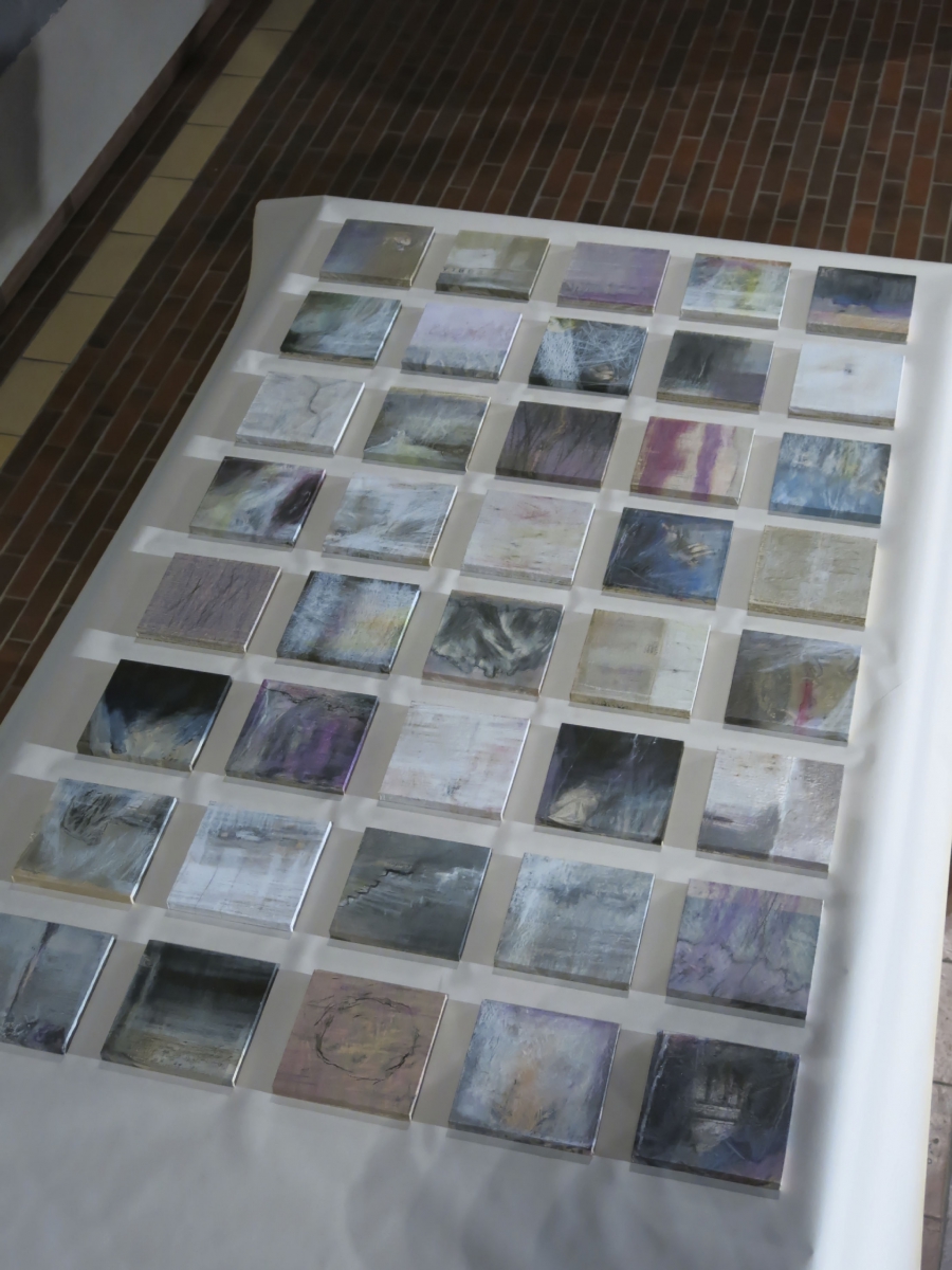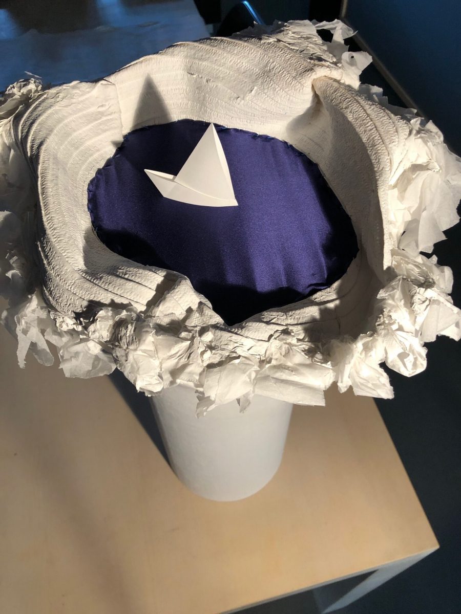 Stille Wasser, 2021; 18×26 Papiergeflecht, Kleenex, Satin/Nähfaden, Schreibpapier