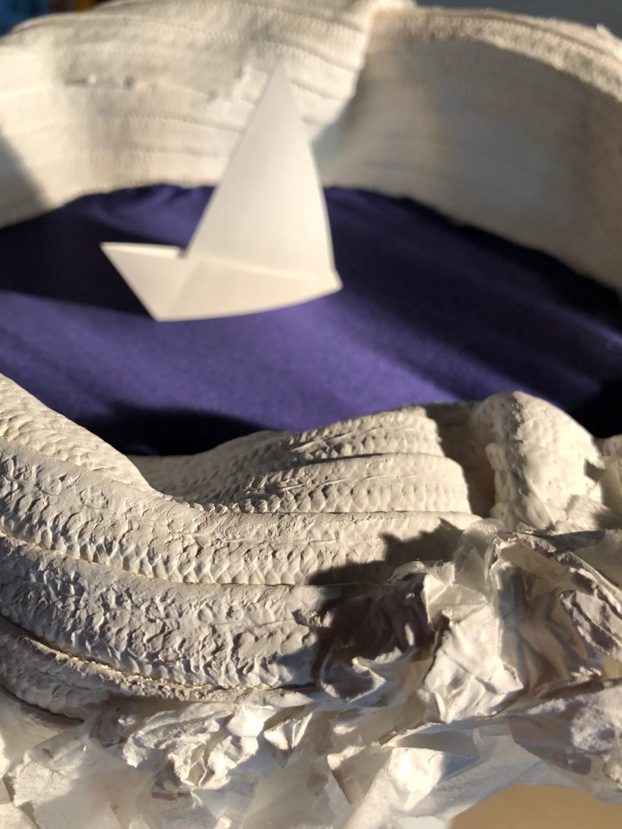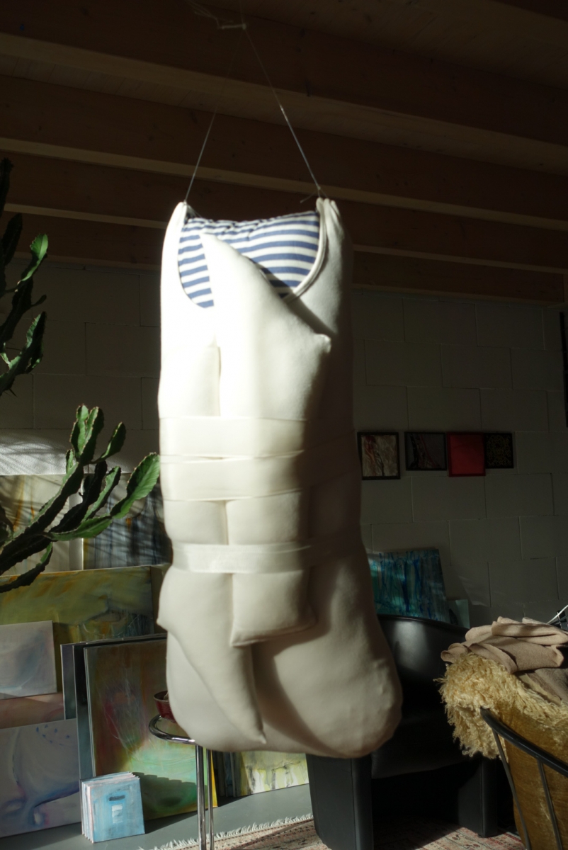 Vorform, 2019; 145×35 Synthetikvlies/Baumwollgarn, Luftpolsterfolie (mehr)